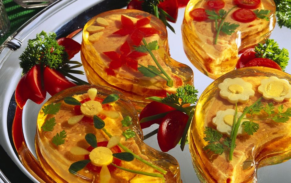 这种果冻是由动物骨骼和软骨制成的,通常和小龙虾、鸡蛋和其他食物搭配在一起。当时厨师们很喜欢把五颜六色的果冻摆成棋盘状。