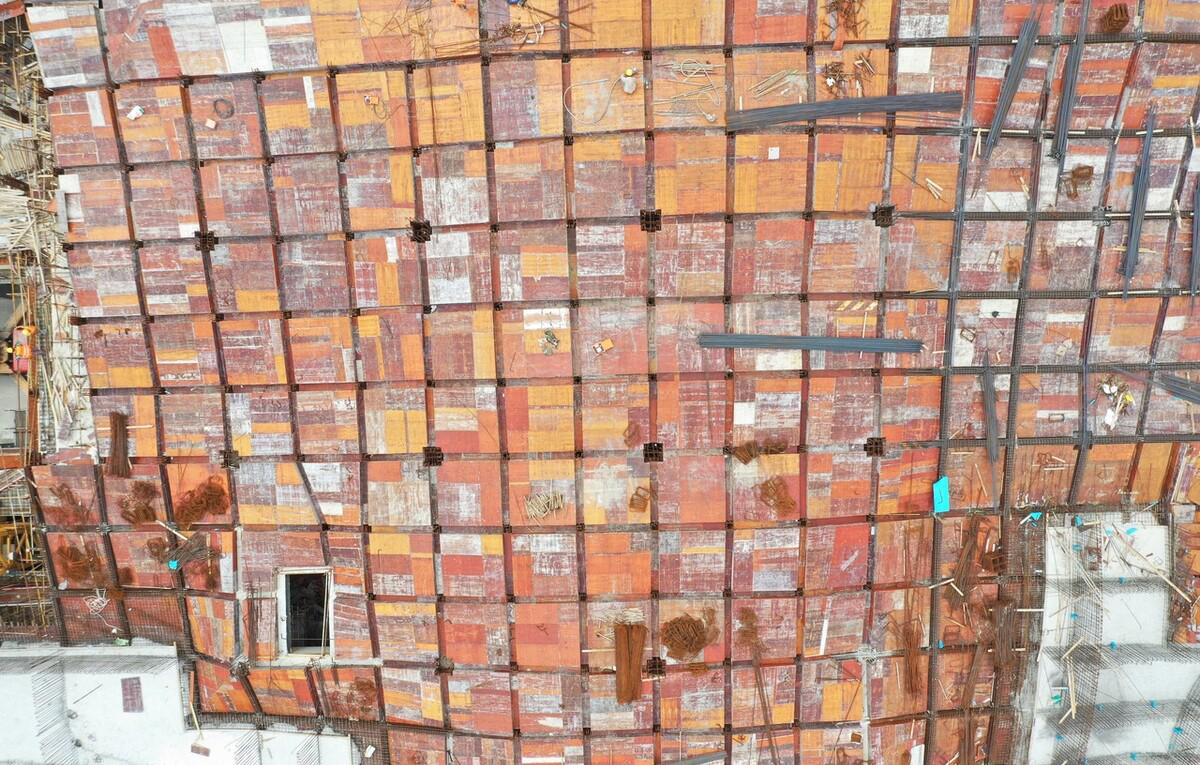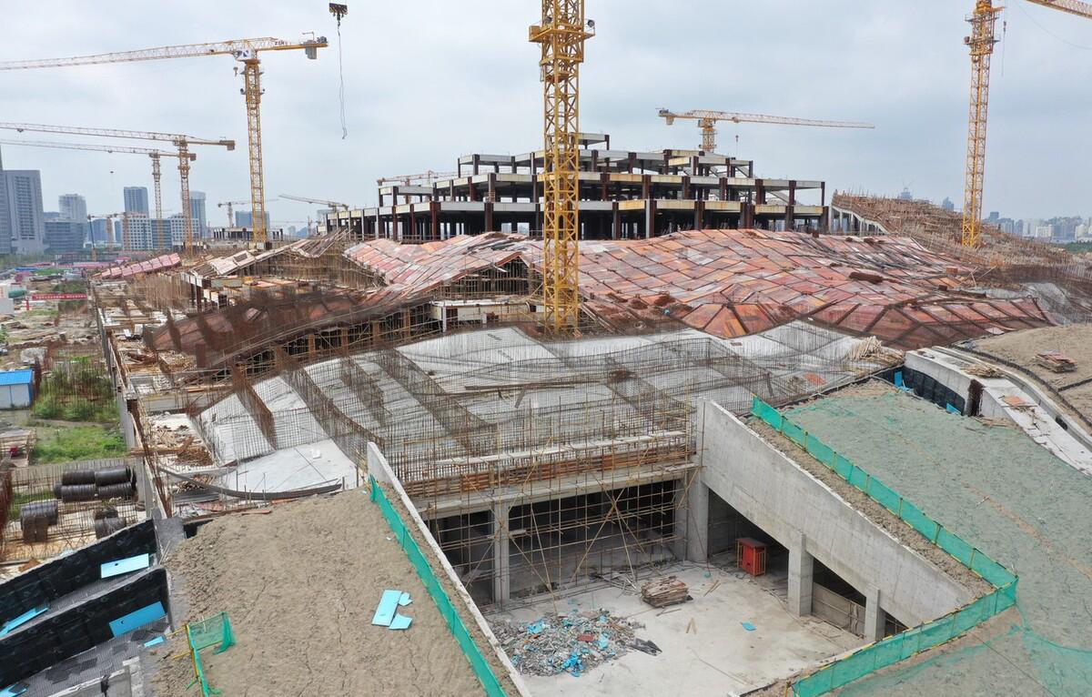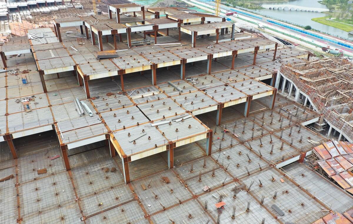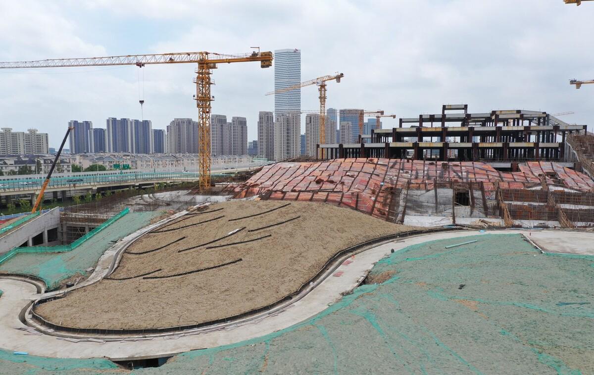 这两座山,并不是上海公园里的那种小土丘,而是拔地而起的真·山,东山高48米,西山高37米。在平地山建造大规模的人工山体,在上海也是第一例。双子山从2020年10月开始建设,到现在已有2年;共计使用了6000根桩,钢结构框架总用钢量3万余吨,是国内最大的包覆钢——混凝土组合结构建筑,内部自然也是别有玄机。