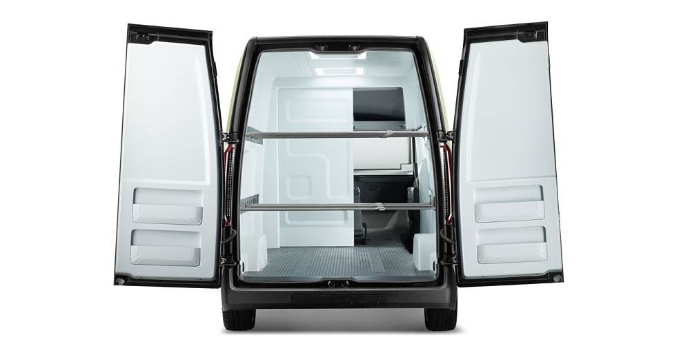 极简主题的内饰设计非常讨巧,主要功能集中在双联屏及下方触控按钮上。作为厢式货运版本,打开尾门后内部同时预留出了更大发挥空间。