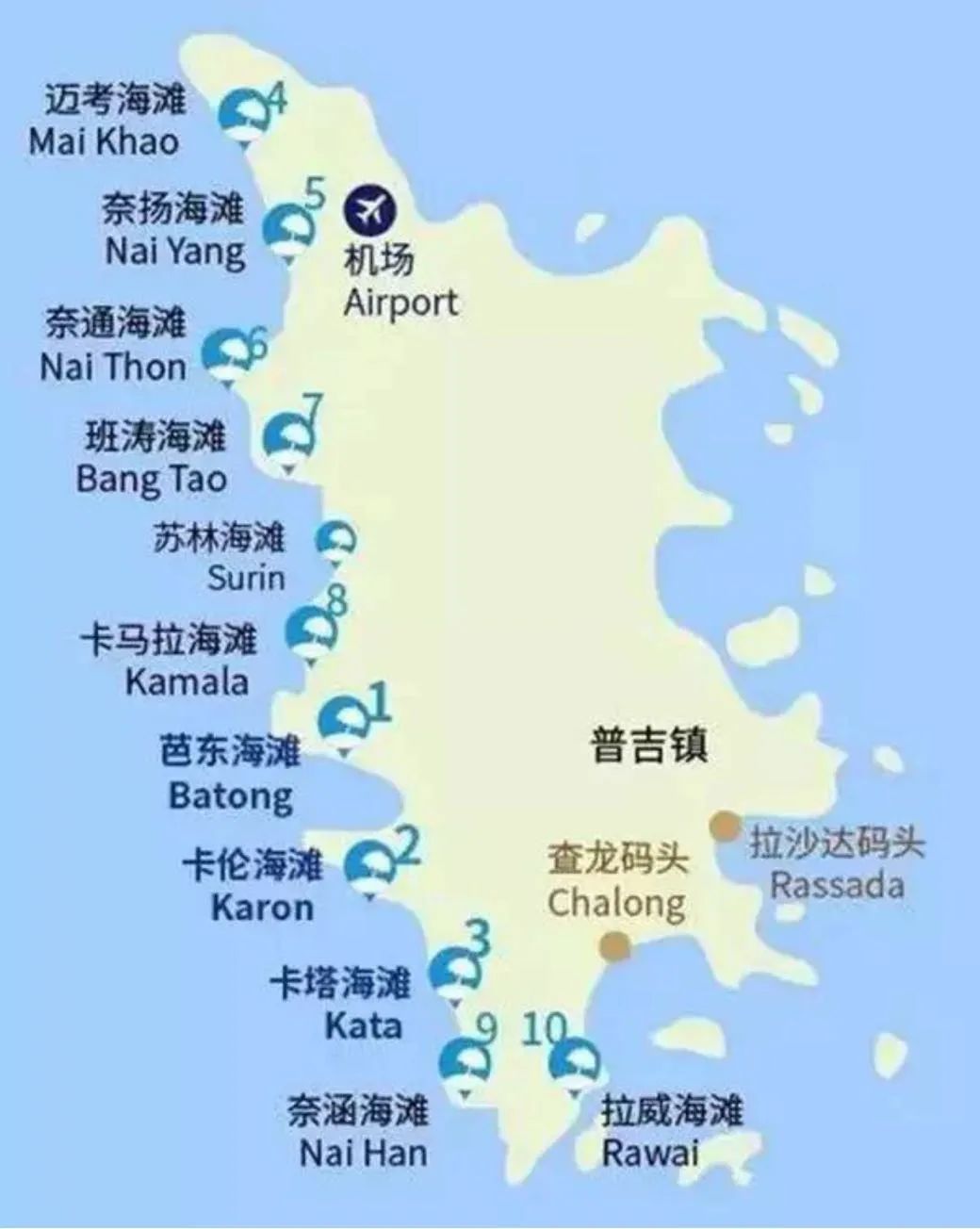 从地图可以看到普吉岛的海滩基本都集中在西侧,其中芭东海滩(Patong)、卡伦海滩(Karon)、卡塔海滩(Kata)这三大沙滩算是来普吉岛玩的入门级海滩了。因为这三个海滩相对来说交通方便,商业设施完善,周边有许多酒店和度假村,选择多。