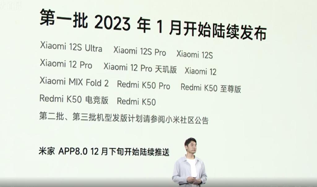 此外,MIUI14还可以共享云空间、共享相册、共享米家智能场景和家人健康数据,并提供家人守护、未成年设备健康使用、老人守护等功能。全新的MIUI14将于2023年1月开始推送,首批推送机型包括小米12S Ultra、Redmi K50至尊版等机型,读者们也可以看下图了解自己的机型何时收到推送。