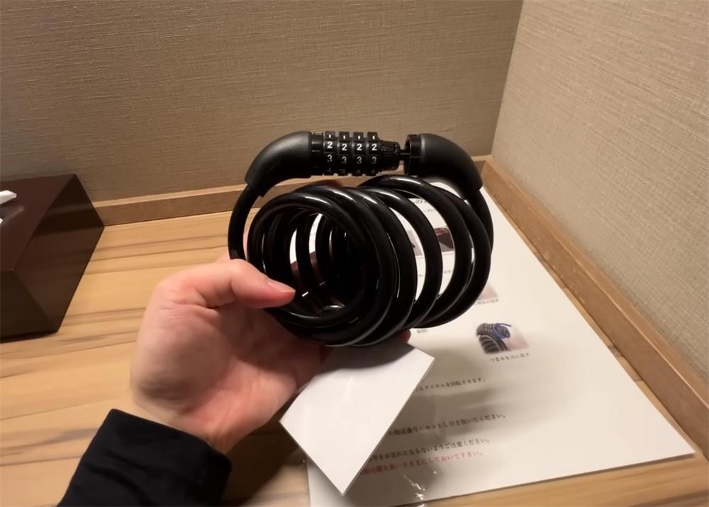前面我们也说了,这间小小的胶囊舱其实是没有门锁的,所以为了行李安全考虑,桌子上还准备了一把密码锁,配合书桌旁边的锁环,可以固定行李箱,安全性会稍微高一些。