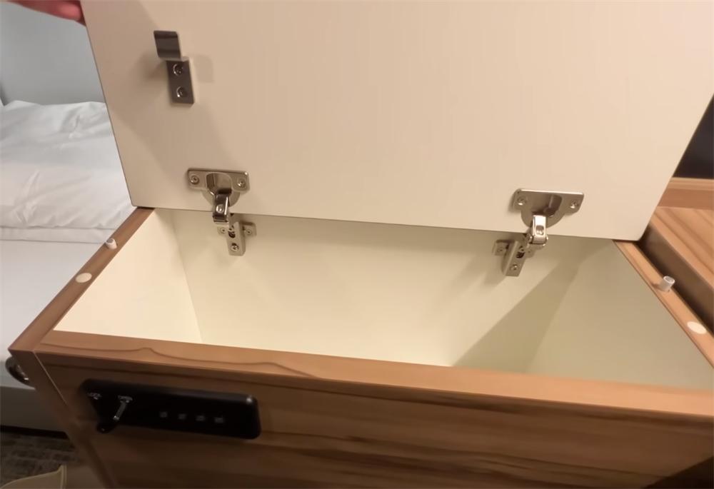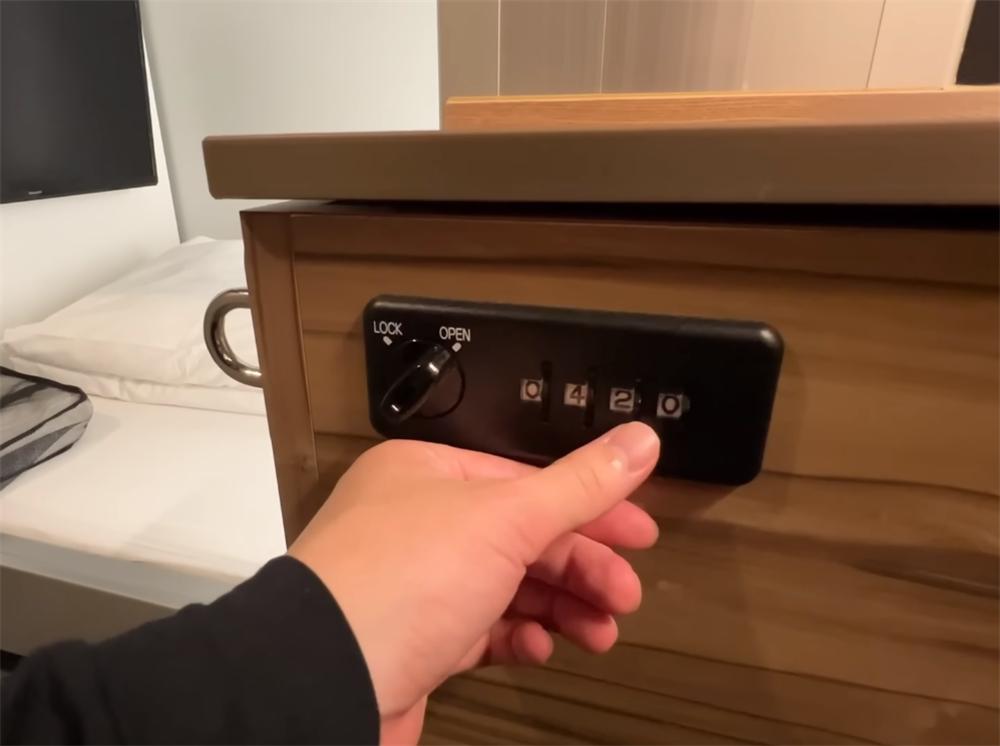 L形书桌的左手边,也做成了一个密码柜(旁边的金属环就是配合锁住行李的位置),柜子的密码是每次入住后都会重置的,如果一直住的话,它相当于一个小小的保险箱。