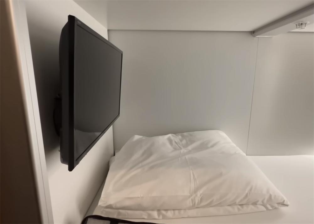 上铺和下铺的床尾部分,都壁挂安装了一台小电视,而且这个小小的胶囊舱格子间隔音非常不错,自己在里面看电视,周围的吸音材料能隔绝大部分噪音,不会互相影响。