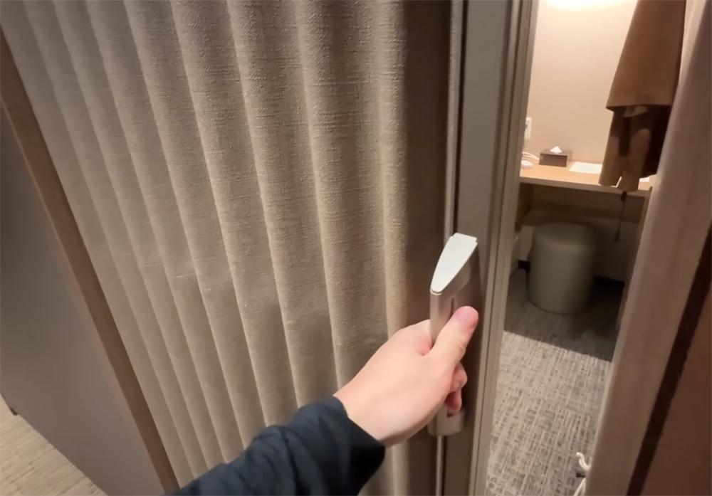 - 我最先注意到的是这扇推拉门,也许是为了消防安全的考虑,门扇本身就是一道类似屏风的布置,并没有安装锁具,个人感觉其实多多少少有点儿没安全感……