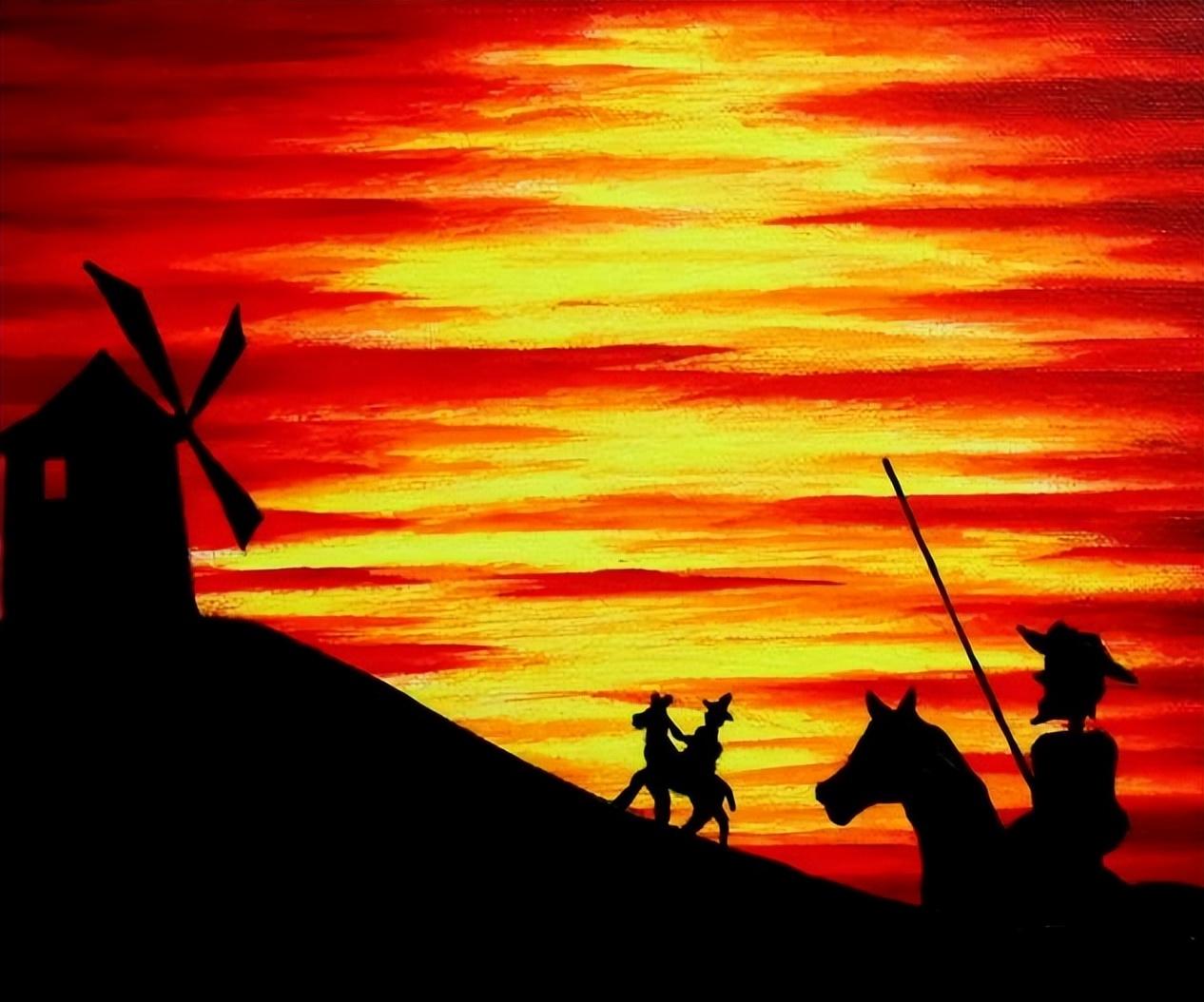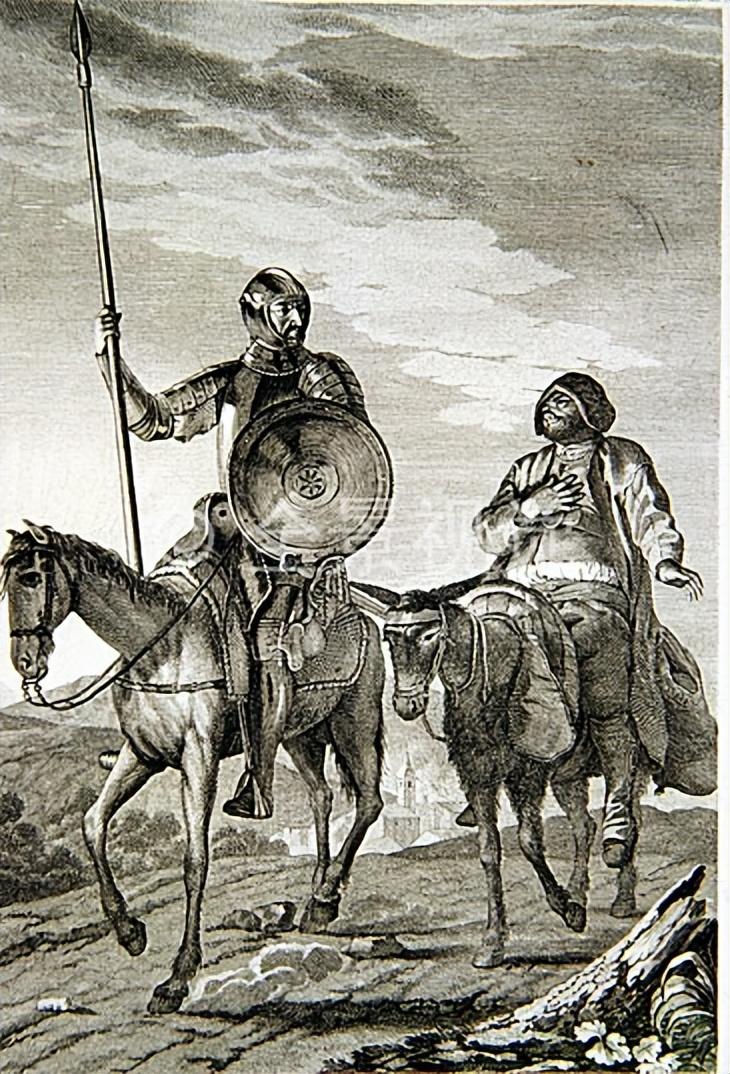 之后不死心的堂吉诃德又说服老实的邻居桑丘·潘沙做随从一起冒险,把旋转的风车当作巨人,把羊群当作军队,闹出不少哭笑不得的笑话。
