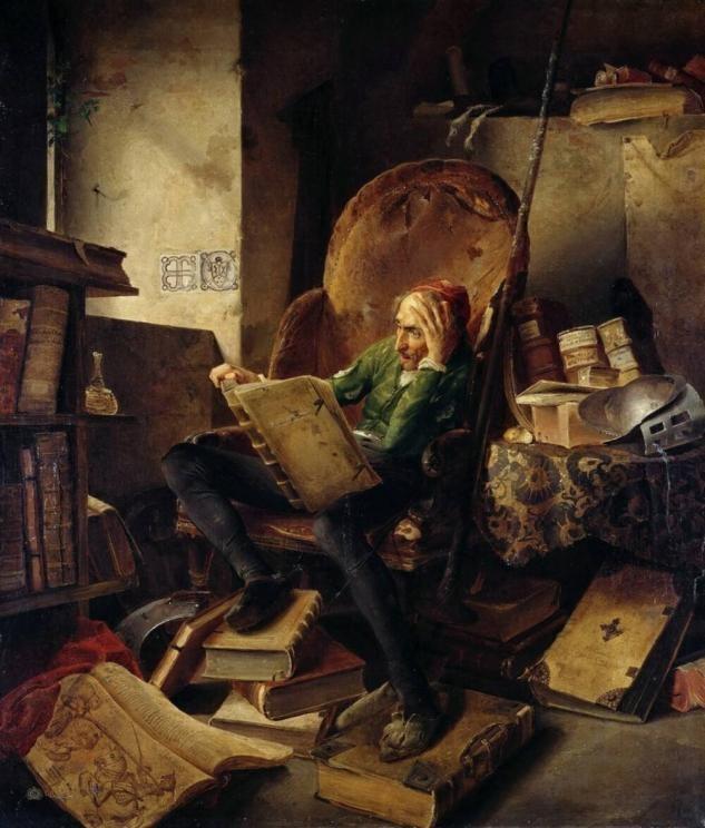 据说他原名大概是吉哈达,是个乡间落没小地主,最大的特点就是沉迷骑士小说,被骑士小说里的离奇情节、虚幻故事迷得神魂颠倒,一年到头就埋头看骑士小说,把家庭、工作都弃之不顾。