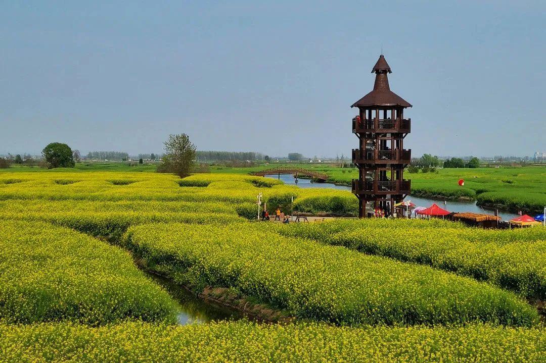 到垛田到欣赏油菜花景,是可以登上附近的城楼远眺的,当然你也可以在景区内租船,泛舟其间,每人付50元就行了。