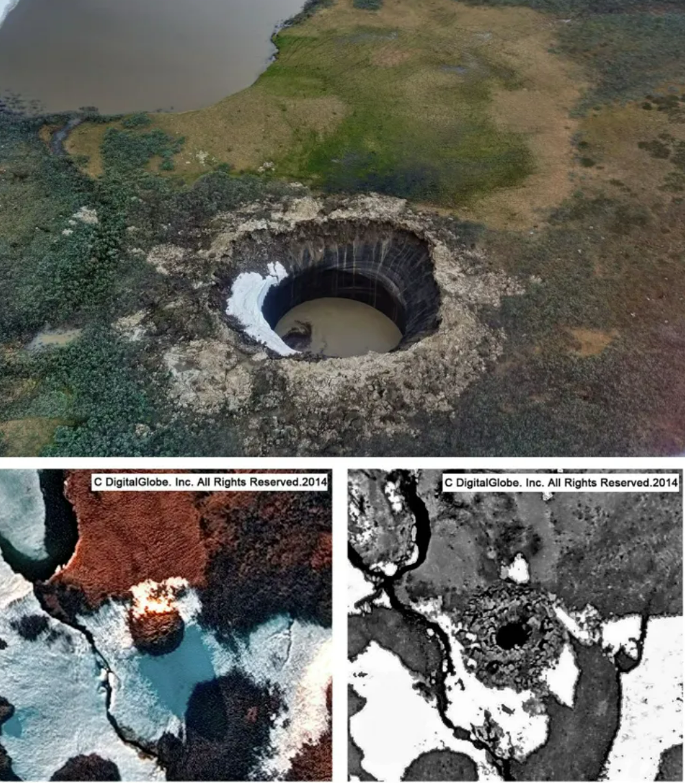2014年的时候,俄罗斯冻土地区就突然出现一个大坑,经过卫星和科学研究发现就是因为地下的甲烷气体因为压力冲破地层爆发出来。