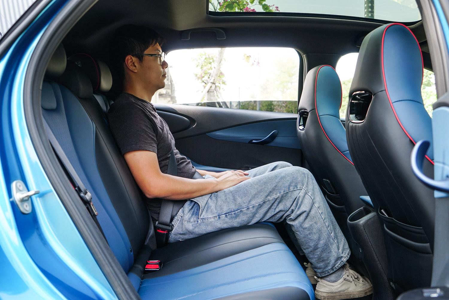 虽然说这两台车的目标群体对后排也许不太看重,但ID.3的实际表现着实给了我惊喜。2765mm的轴距,让它的腿部空间比海豚更宽裕,关键是坐垫倾角更大,臀点离地台更高,意味着对大腿的支撑很棒,从图中模特大腿位置也能看出来,ID.3显然承托更到位。