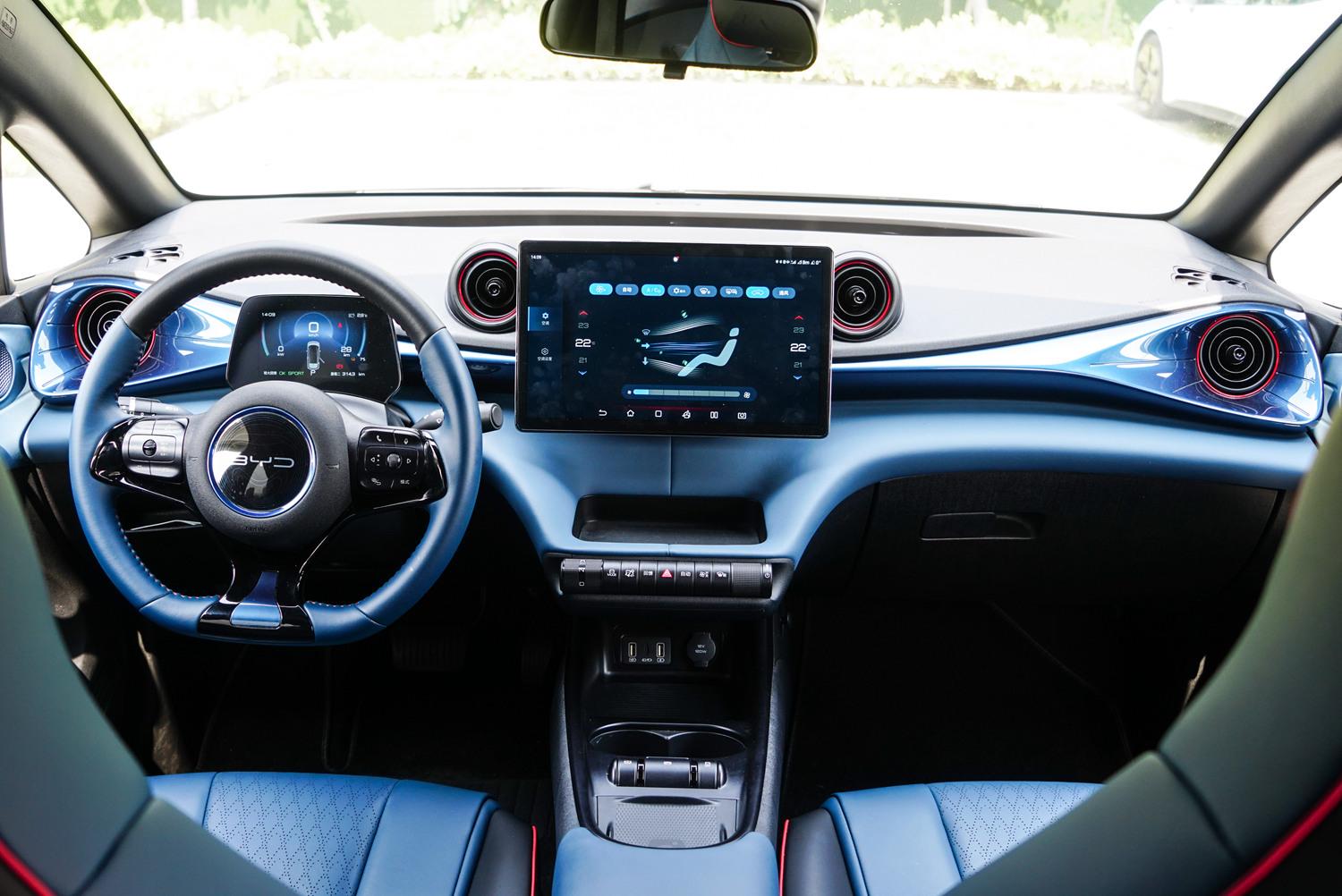 海豚的内饰设计融入大量的海洋元素,包括上下电、提示音等都经过特别处理,和ID.3那种简约风格完全相反,海豚显然是做加法的,像可旋转的屏幕、旋钮空调出风口、亮面的饰板等等,而且浓郁的深蓝色调也比较考验是否合眼缘。